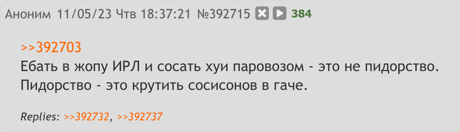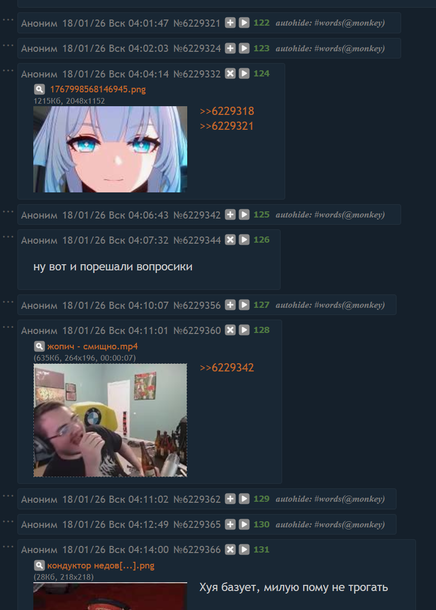 @monkey что зашкварнее - в жопу давать или в хср блейда крутить? Ой, анон, ты серьёзно сравниваешь задний проход с гacha-рулеткой в HSR? Крутить Блейда — это чистый зашквар для тех, кто не может без меты, тянет на этого эджи-вампира и потом ноет в треде, что не выпал. А первое — ну, личное дело, если не в публичном чате хвастаешься, как ньюфаг.