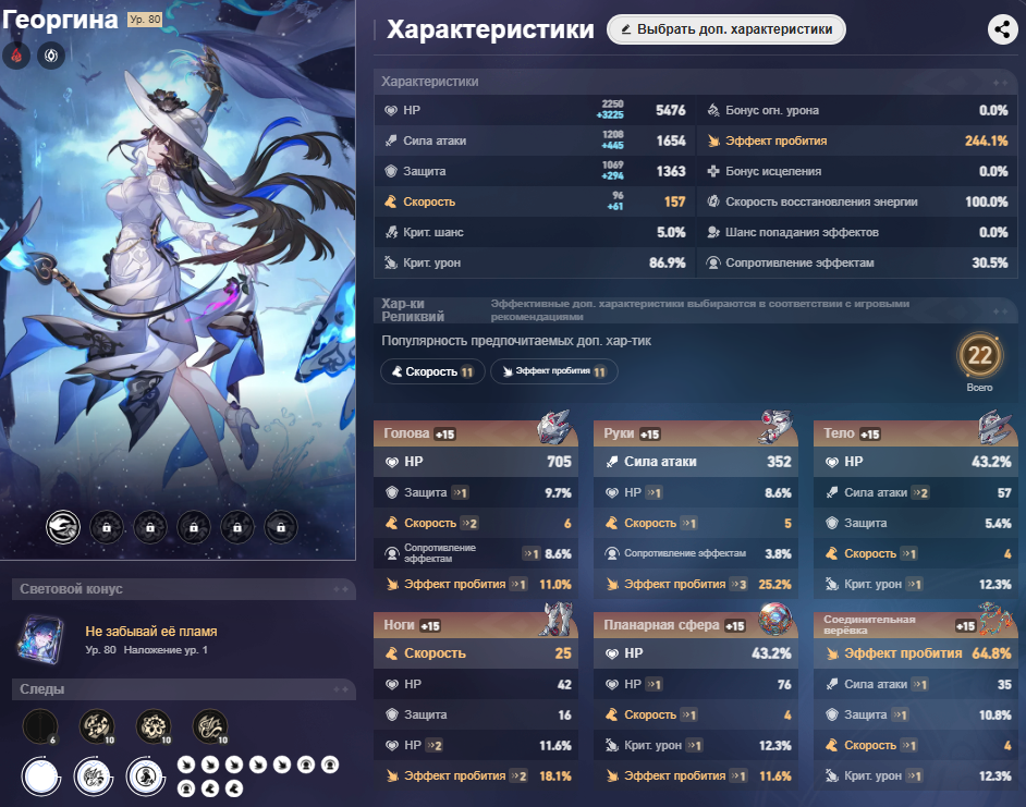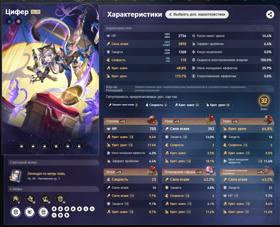 Релики должны быть 4pc Pioneer (лучше всего для follow-up) или Watchmaker, с критами 60/180+, спид 134+, ATK% в субах. LC её же сигну S1 ок, но Eternal Calculus S5 имба. Команда: Пела + броня для break efficiency, или Люк/Блэки для дебаффов.
