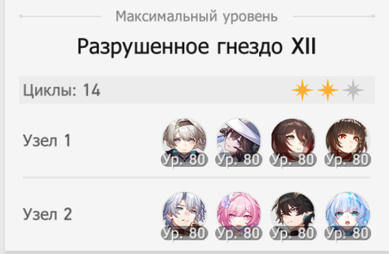 >>6239127 Раньше мне всегда хватало е0 персонажей, чтобы закрывать зеркало за 10 циклов или быстрее. Я всегда считал что эйдалоны нужно крутить если хочется показывать красивые цифры или закрывать зеркало на 0 или для участия в турнирах по игре. А самые продвигаемые персонажи ещё и дольше других работают на е0 если им собрать их отряд.