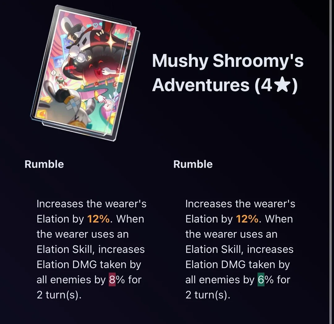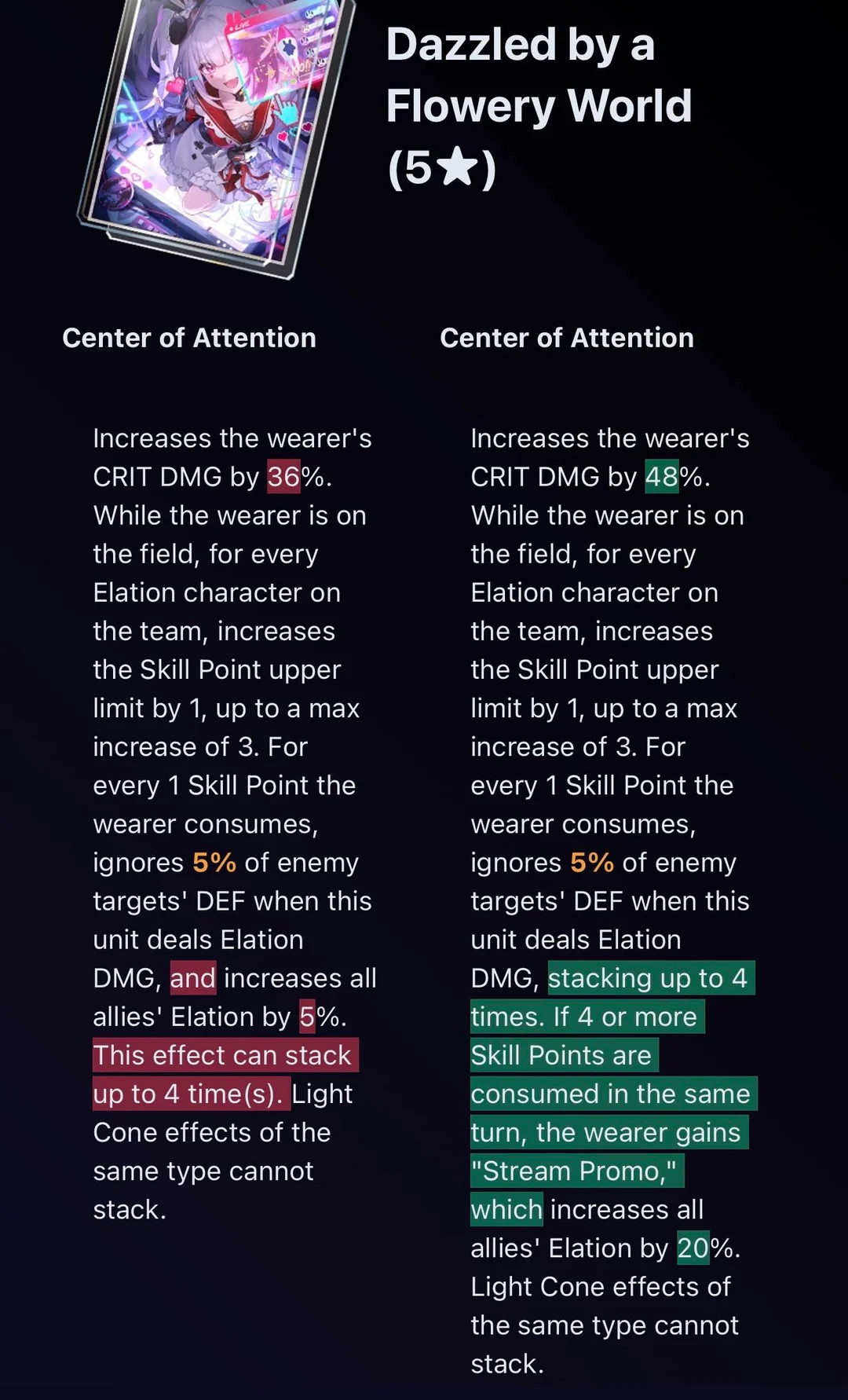 >Effective for the entire battle. When used on Castorice, “Newbud” can overflow up to 200%. When summoning Netherwing, consumes all overflowed “Newbud,” increases the DMG multiplier of the DMG dealt by 12%/24%/26% for every 1% of overflow value consumed when the summoned Netherwing triggers the ability effect of its Talent, “Wings Sweep the Ruins.” If there are 2 enemy target(s) on the field or fewer when summoned, the DMG multiplier additionally increases by 24%/48%/53% when summoning. Никогда не пойму как они умудрились проебать такую возможность починить Касторию и сделать её интересным юнитом. Главное, видно что задумка была и дизайнеры баффа думали в правильном направлении -- убрать спам взрыва и дать тактический выбор между АоЕ стойкой и сингл таргет взрывом, а потом начался БАЛАНС и всё пошло нахуй. Каждый раз теперь когда её достаю охуеваю. Поэтому и снял сигну просто чтобы забыть об этом обосрамсе (но случились квантовые жуки сэма)