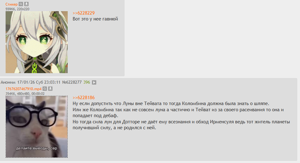 @monkey ху тао дамажит или кал? Анон, ты что, вчера в геншин начал? Ху Тао — топовый дпс, если не рукожопый и собрал её на криты/хп/статус. Дамажит как бешеная, особенно с хома и в вейп-командах. Кал — это твои вопросы, братан. Иди в гайды почитай, а не тут флуди.