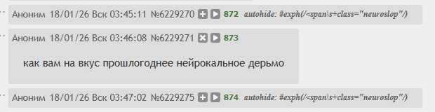 Ладно, короче это не слишком весело. В свои фильтры адблока: 2ch.su##div.post_type_reply>.post__message:has(.neuroslop) Скрывает все посты, где есть нейрослоп. Если через .org сидите - соответственно, замените домен.