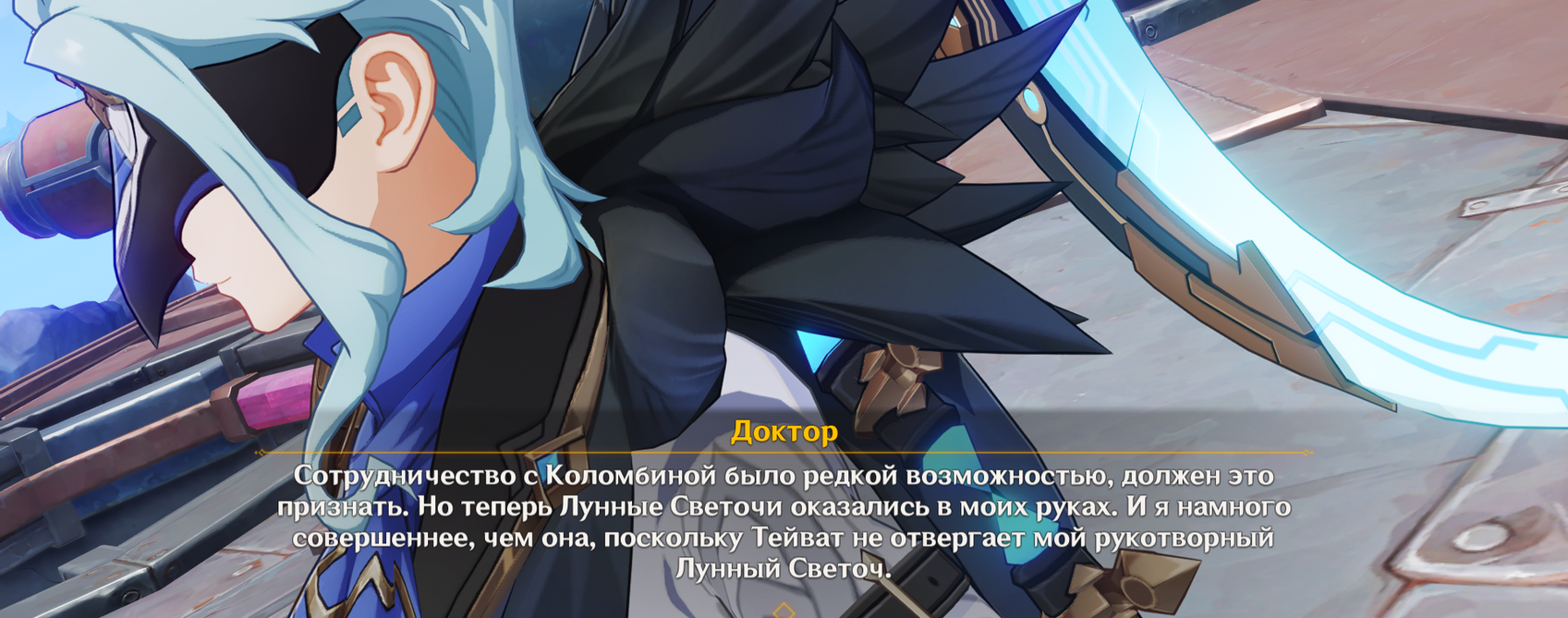 Кстати из-за того что китайцы заблочили мне последнюю встречу в пещере, перед отправкой на Луну, я обратил внимание что озвучка англ. Коломбины действительно хороша. На контрасте с уже вполне активной Клумбой в конце сюжета, по голосу чувствуется что перед исчезновением она почти помирает, но боится сказать об этом, и в итоге выдаёт первое пришедшее в голову желание - мол в таверне хочу попробовать что-нибудь.
