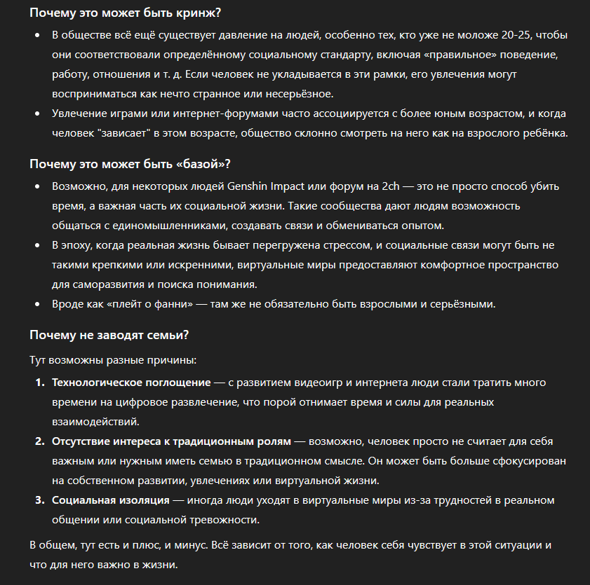 @monkey как думаешь, когда человеку в 30 лет и всё, что есть в его жизни, это тряска по игре Genshin Impact и по соответствующему треду, это кринж или база? Почему они сидят тут, а не заводят семьи?