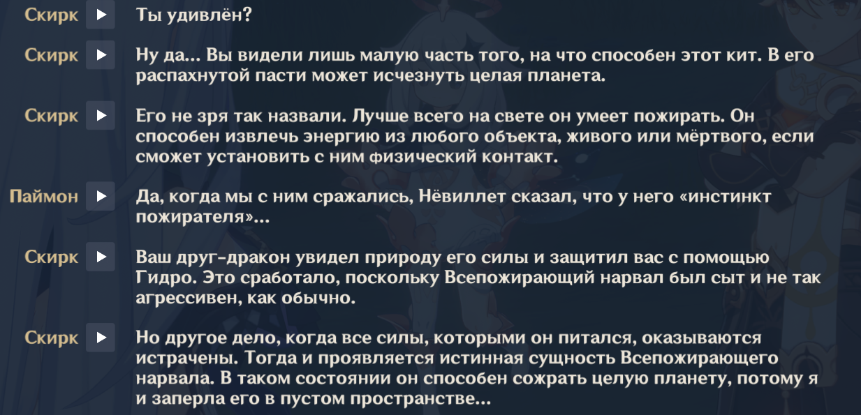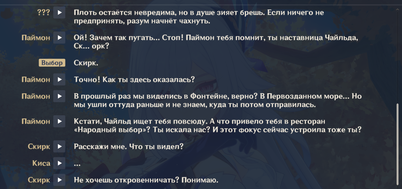>>6258382 >>6258391 >>6258402 >Как ты вообще умудрился ее скипнуть >Зачем ты ризли крутил >Есть жопич, нет Фурины Отвечу сразу всем, ибо ответ один — я падисар! не нравится мне Фурина. Вот, специально нашёл момент из квеста. Вот начиная отсюда я сразу понял, что с данным человеком нам не по пути и я либо убью её, либо себя, если нас запрут в одной комнате. Вот прям всем своим естеством она лично мне неприятна и даже противна, ну что я сделаю. А тратить крутки на подобного персонажа это дурость. Ризли крутил потому что мужик крутой, в последние дни баннера еле-еле забрал, баланс гемов в ноль слил. В целом, доволен, боевой единицей его никогда не считал, но так, по миру побегать, поприкалываться сойдёт. Вот.