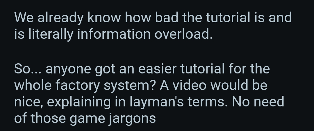 Ладно, за два дня понял, что это просто не моя игра. Слишком много информации и о заводах и о боёвке и о всякой ненужной хуйне. Это просто утомительно. Игра красивая, исследовать мир и пилоны расставлять понравилось, но просто не моё. Спасибо, что приютили в треде на несколько дней, пойду обратно аутировать в хср.