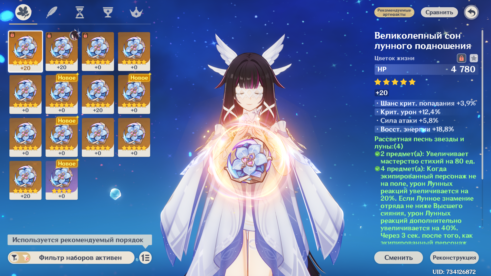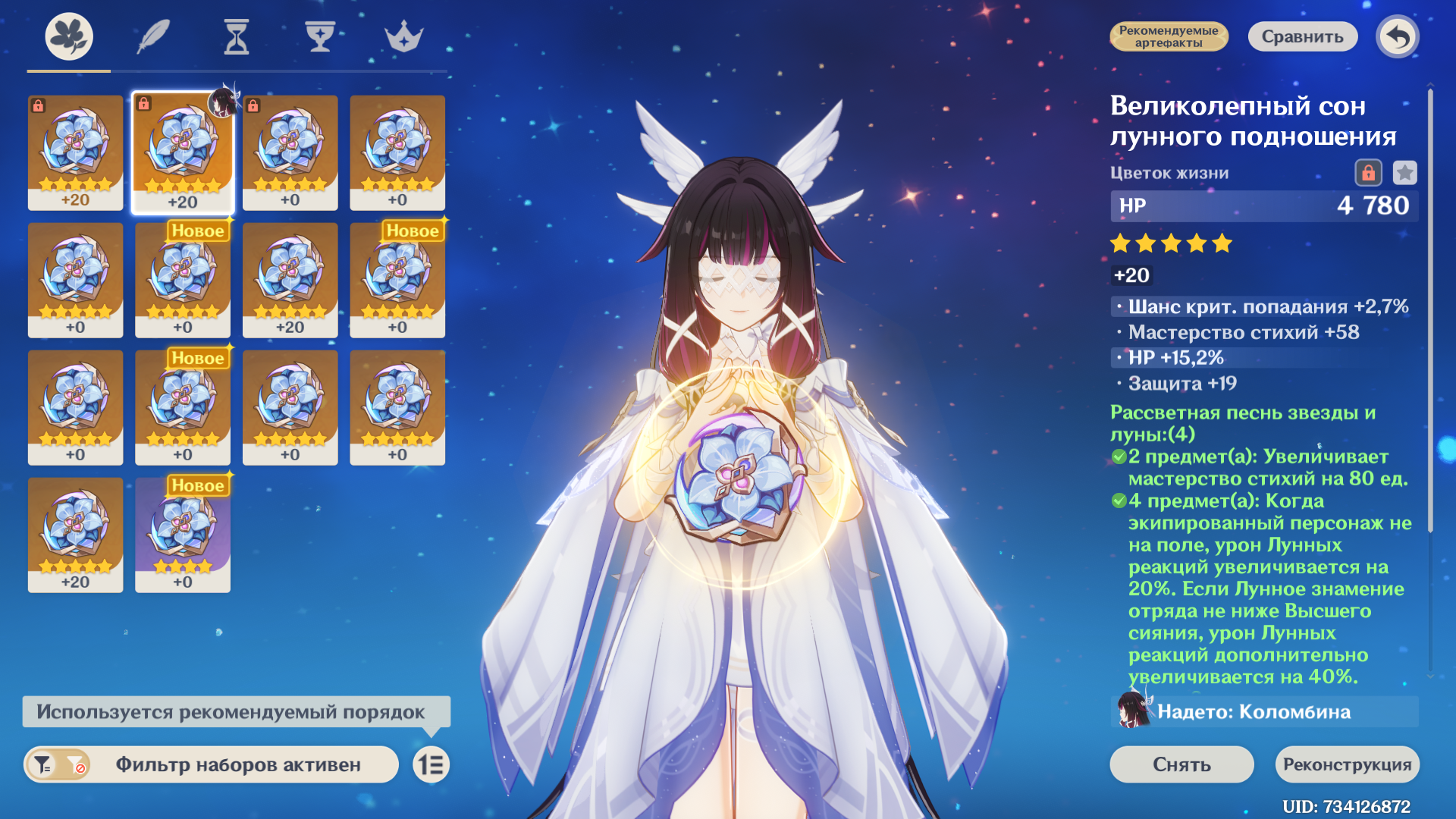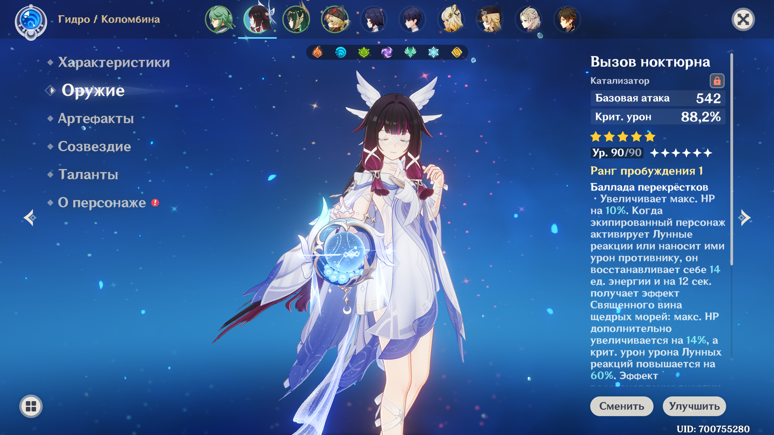 С крафтом и без конст вот такой результат. Но мне в артах конкретно на Нефер дохуя критшанса навалило, и урон пока выше этого разогнать не выходит. Надо минимум 200 крит.урона, чтобы позоричные 120 сек превратить в 110