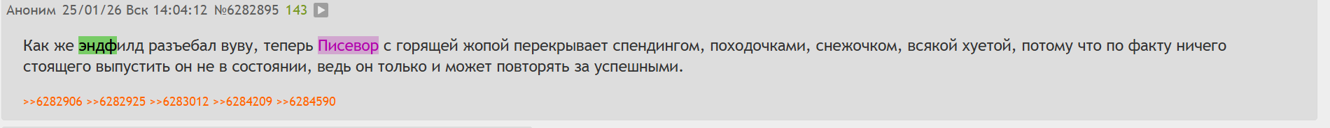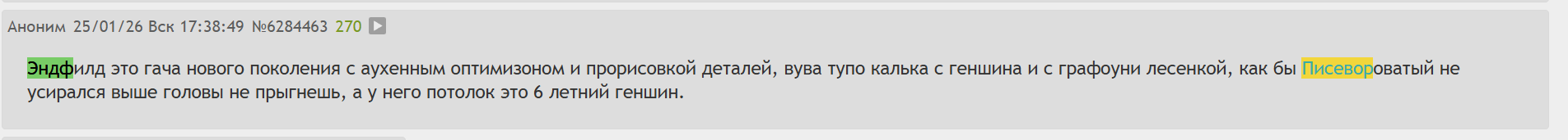>>6287329 А в каком аспекте вувно является калом? Я играл в г с релиза 3 года, в зюзю год. Хонкал не трогал, ибо не фанат мобильного гейминга. Ну и из моего опыта графика- лучшая среди гач, как 3д художник могу сказать однозначно. Сюжетом ничем не хуже, но и не лучше других гач. Механически самая сложная игра среди всех гач, что тоже не дает плюсов, но и минусов тоже, ибо казуалов примерно столько же, как и трайхардов. Дизайны не нейрослопные, персонажики красивые, Эндфилд только планку держит, если не выше стоит, но это зависит от будущих дизайнов. >>6287349 >>6287330 Ну бля, гордыня ебаная, наверное, за то, что игра из сыро-косой релизной версии превратилась буквально в современный стандарт гачагейминга в техническом плане. >>6287346 > ляочелы особо не орали А чего орать-то им, если их два проекта скурвились и доживают свой век на ца сисов и <18? ИМХО лучше сразу ЕОСнуться, чем следовать пути геншина. >>6287362 >>6287424 Сейм, играю в два проекта и сижу-пержу, в вува-треде вообще, когда про Эндфилд заходил разговор, челы говорили что завод будет хорошим релаксатором после долбёжки по кнопкам в ротациях. Создается впечатление, что здесь просто сидит один-два ебнутых хейтерка и сами себе семенят поочередно.
