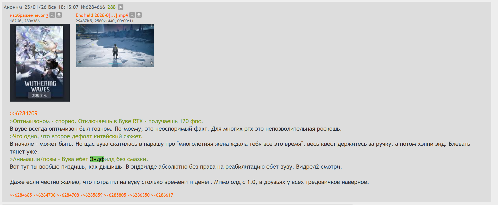 По поводу оптимизации, со стороны некропеки, неиронично вува лучше. Постоянные утечки памяти, краши (с релиза раз 20 уже крашнулось), дропы фпс в диалогах китая (это вообще как нахуй, смена ракурса делит фпс на 10), но это пофиксят. В вуве было ноль вылетов за год+, только небольшие проблемы на релизе 2.0 которые быстро пофиксили за неделю. Графений плюс минус один и тот же (со стороны минимально-средних). Анимации в эндфилде говно (лицевые дак вообще угар со странными ебальникам), диалоги это геншин 1.1 где сука пять рыл стоят как вкопанные и трясут головами (только тантан как-то разбавила этот сюр) и делают одни и те же пару действий по миллиону раз (поднести руку к груди, показать палец вверх и т.п.), катсцен на всю долину 4 дай боже наберётся на полторы минуты времени. Дизайны персов лютый кал, вообще ни кем не зацепили (кроме некоторых пятерок), но это уже дело вкуса.