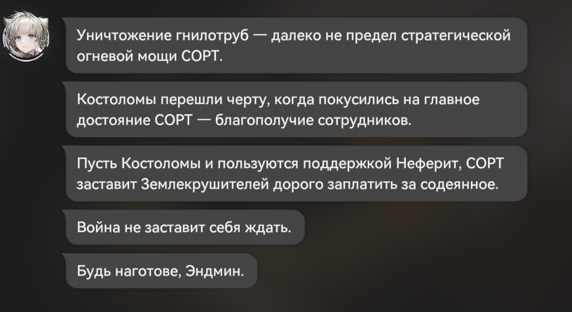 Вот сейчас вас приучают к тому, что вы суперимбовый ЭНДМИНИСТРАТОР, и если бы не было Перлики, были бы главой Endfield Industries. Вас многие знают, красная шапка вообще мастурбирует на вас не то что по ночам, а прям среди дня, прям при вас. Всё так хорошо, у вас всё получается. И всё это нужно только для того, чтобы с следующем патче ебнуть мрачняком, и вы всё таки стали главой Endfield Industries...