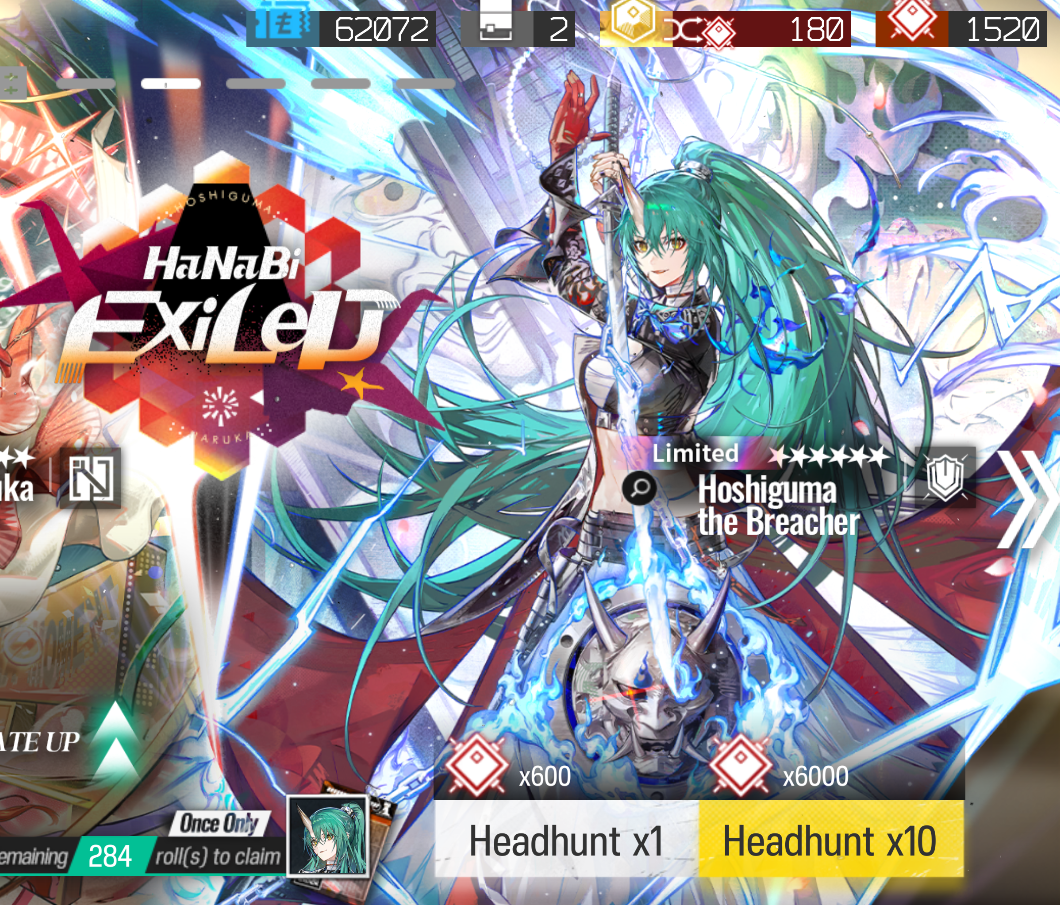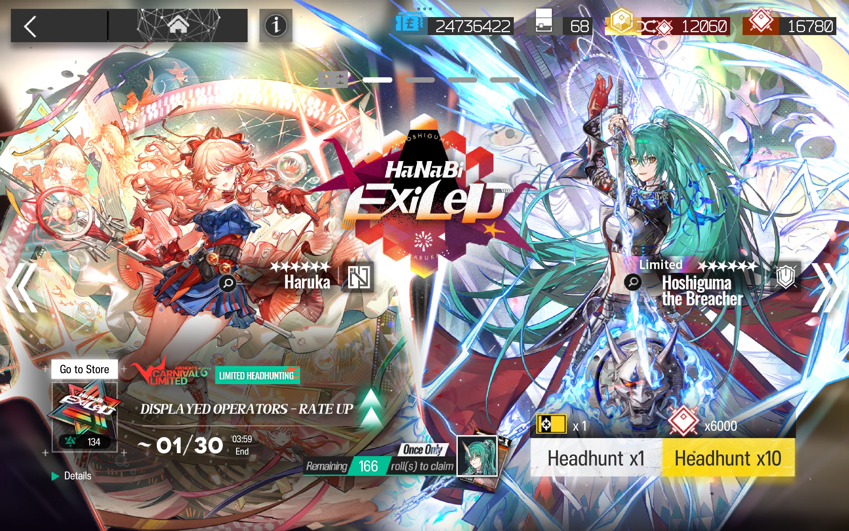 Баннер: [Carnival] Hanabi Exiled (с 16 января по 30 января): 6★: Hoshiguma the Breacher / Haruka 6★ Лимитные оффбанеры: Pepe / Eyjafjalla the Hvít Aska / Gavial the Invincible 5★: Kichisei