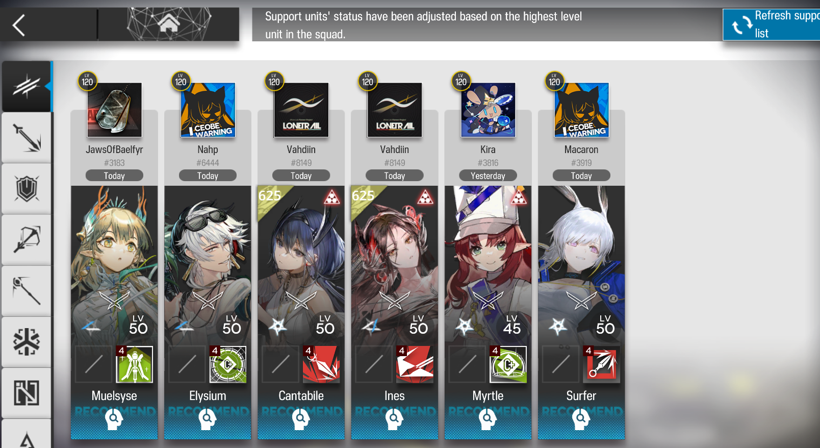 >>6294685 >А саппорт от других игроков обязателен? Не обязателен. Но если не вывозишь, берёшь "саппортом" опера у друзвок или рандомов — у них он как правило, прокачен. Твоих оперов в любом случае 12 штук, саппорт встаёт тринадцатым. Не путай с классом операторов "саппорты", разные штуки. За использование саппорта раз в сутки даётся 30 валюты в магазине ежедневных штук всяких. Но можно и не использовать.