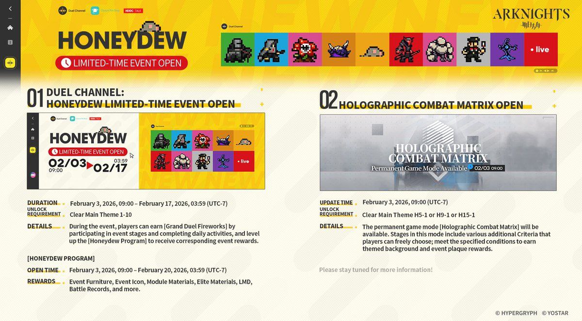 23 января стартовал Contigency Contract: Season #4 Battleplan Arclight, новой бэнгер музыкой и механиками из ивента Лон трейла, усложняйте себе жизнь чтобы получить больше наград, всё как обычно Вместе с контрактами начинается Джоинт баннер, в котором будут падать только те 5-6★, которые указаны в списке: 6★:Quibai / Nymph / Entelechia / Necrass 5★: Alanna / Aroma / Windflit / Paprika / Gracebearer / Vendela