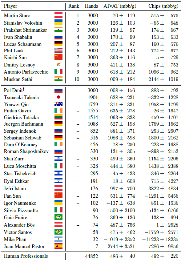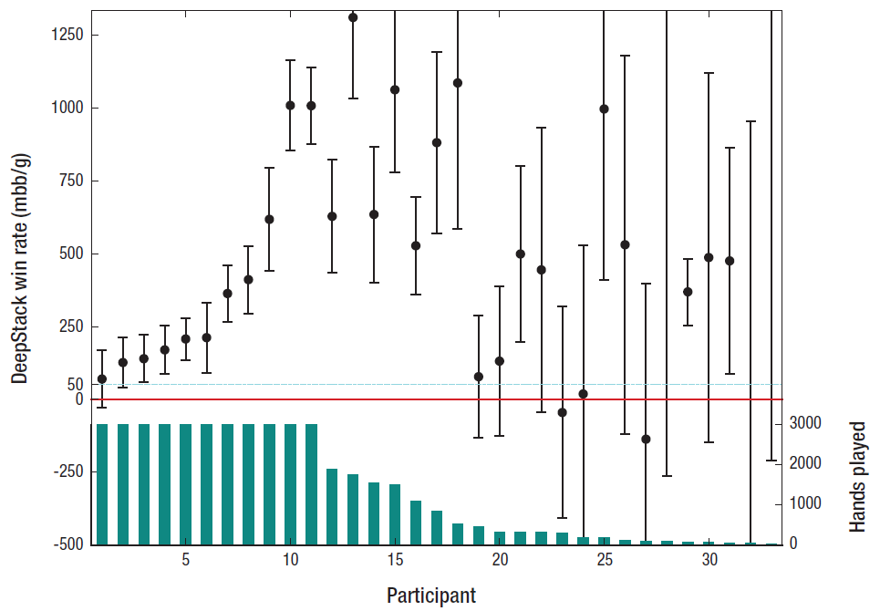 >На данный момент DeepStack сыграл 44 852 руки против профессионалов добровольцев, отобранных Международной федерацией покера. Игроки получали денежные призы за хорошую игру (первый приз $5000 CAD), так что люди играли в полную силу. Тем не менее, программа в хорошем плюсе.