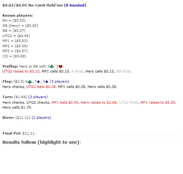 Ответ: Колла на 3бет не было, пот одсы 27%, эквити руки 21%, колл конбета оппа неверен, пот одсы 28% эквити руки 19%. У оппа оказались 33, я проиграл.
