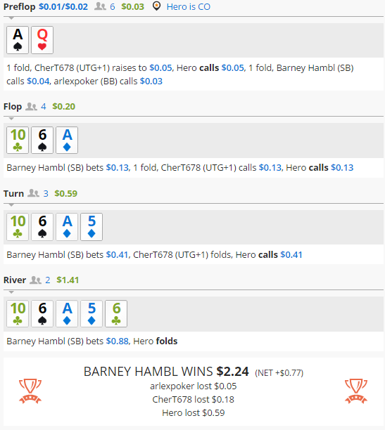 BU: Villain ($11.52 in chips) BB: Hero ($6.88 in chips) HOLE CARDS Dealt to Hero [5s As] EP folds MP folds CO folds Villain: raises $0.10 to $0.15 SB folds Hero: raises $0.19 to $0.34 Villain: calls $0.19 FLOP [4c 2s 2c] Hero: bets $0.44 Villain: calls $0.44 TURN [4c 2s 2c] [Jd] Hero: bets $1.06 Villain: calls $1.06 RIVER [4c 2s 2c Jd] [7h] Hero: bets $5.04 and is all-in Villain: folds Uncalled bet ($5.04) returned to Hero Hero collected $3.55 from pot