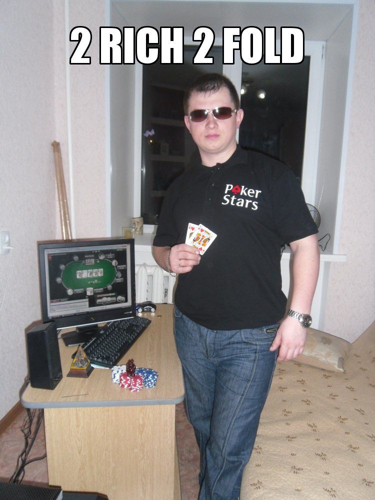 >>15503 Чёт я с тебя в голос усираюсь. Ты настоящий, али всё-таки жирный такой? Тебе вообще 18 есть? А то что-то сомнения берут. До 18 в покер играть нельзя.
