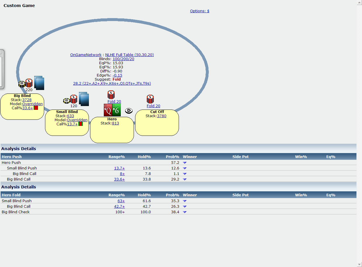 >>17023 Он автоматом подхватывает руки и считает, как я думаю, стандартно вин/пот оддсы, в зависимости от позиции, величины банка, кол-ва оппов и т.д. Вот, в принципе, ссылка: http://www.holdemindicator.com/ru/ На фантики он бесплатный. И вот в данной раздаче, он мне показывал положительный колл на всех улицах, а на тёрне так и вообще аппетитные оддсы, несмотря на то, что опп-хуй пошёл в алын. Не хуита ли часом эта прога и буду я сосать хуи на дистанции за такие коллы? Вот этот вопрос мучает.