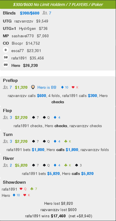 Суть в том, что тот парень уж больно лузовый и до этого он хотел у меня украсть блайнд, я ему рейзанул, он ответил и заколировал на сухом флопе. Там я сделал ставку и он скинул довольно крупный банк в 9.5 блайднов. Поэтому я думал, что опп имеет на меня зуб и хочет блефовать. Сейчас смотрю на раздачу и думаю, что еще хорошо справился. Ибо я мог еще на флопе поставить, получить колл и за ним короля, который бы мне уверености предал.