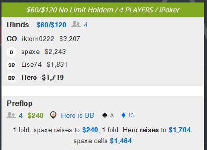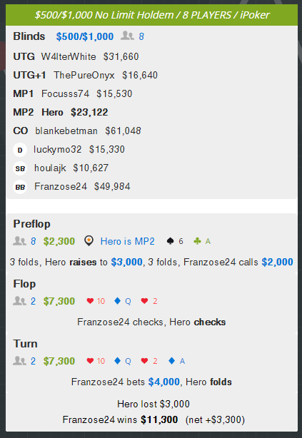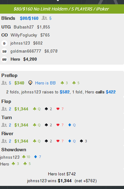 Вот здесь еще думаю, может быть на терне уже следовало скинуть, хотя все говорит за колл же. Опп неизвестен. Просто последнее время мне что-то плохо заходит, дро не закрываются, сеты не проплачивают и все такое, и я начал сомневаться в правильности своей игры. Может я ищу проблемы там, где их нет?