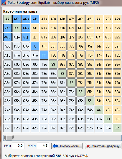 Против этого оппа я очень жёстко зарубался на блинах и он меня не раз вскрывал, так что думаю, он меня пометил агромакакой или предполагает, что я таковой а это так, блядь. На CO он трибетит 8%, падает на 4бет 58% (допустим, на любой позе). Остаётся 4.6%, т.е. мусора хватает, который он под такую макаку бы завёл в дипах. Если убрать слоуплеи КК и АА, остаётся примерно следующее (пик 2).