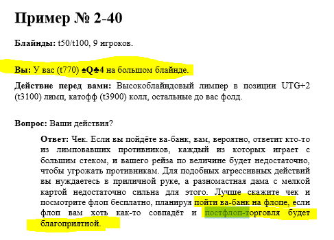 9) Фолдить Q9, QT, QJ, JT, KT, A9, 87s и т.п. в ответ на мини-3бет от рыбы. Почему: диапазон мини-3бет ОЧЕНЬ неполярный и включает в себя KJ, AQ, AJ, QJ, JT, AT и т.п. То есть все руки, которые будут вас доминировать. Вы не сможете избавиться от совей топ пары в мелком банке и будете только проигрывать. Позволительно коллить с карманными парами против мини-3бетов на сет (если у оппонента в стэке больше 80бб).