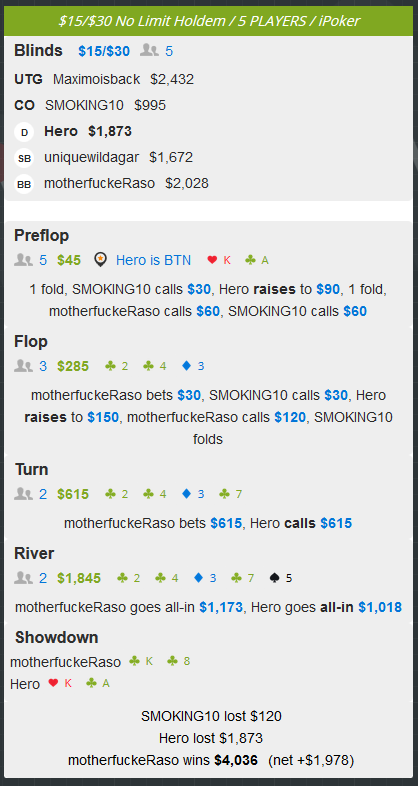 Кароч тот парень с 47% впипа действительно широко лимпил и КАЖДЫЙ РАЗ ебашил минбет. И он действительно много фишек проиграл и чудом отскочил. В общем, моё к нему недоверие было обусловнено. А дальше... Что скажете?