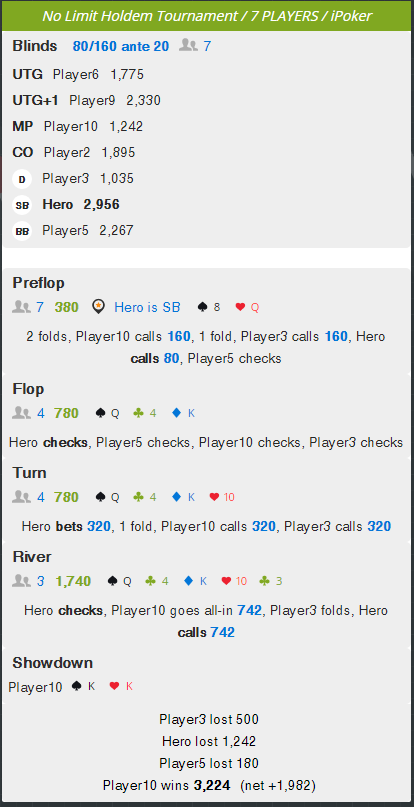 Правильно ли я выбрал розыгрыш руки. Был ли колл на 3 бет? Я на СО QQ, опп на мб, регуляр (9200рук, 20/17, конбет флопа 62%, фолд на конбет 54, колд колл 9%, сб 6%, 3бет 7%)