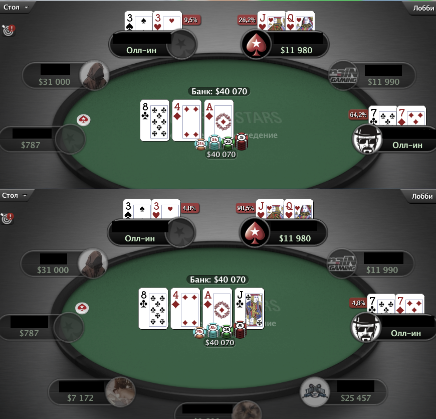 Какого хуя в обучающих видосах показывают проценты сферические в вакууме. Типа если у тебя на флопе флеш-стрит-дро то шанс на победку 48%. В реале же это надо делить на 2. На такие карты разве что блефовать можно, остальные ведутся на идеальные проценты.