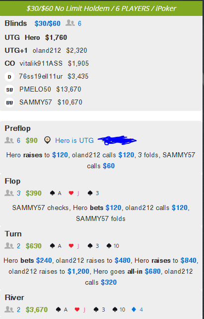 Вот такой нашел. Вот я сыграл раздачу, и понял, что допустил ошибку. Посмотрел на еквилабе - у меня там 64% на победу, 2к3, шансы к банку 1к2 - вроде всё правильно если я не туплю, но всёравно как-то не даёт мне покоя эта раздача. Как думаете?