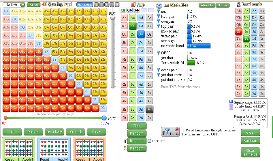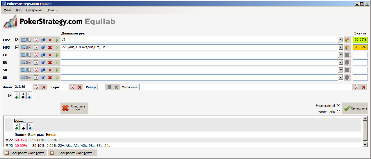 Ты сам забиваешь туда рендж во время раздачи? >>17022 Топ пара не всегда твой аут. Она закрывает ОЕСД и может усиливать готовые руки оппа. Забей в эквилабе или флопзилле предполагаемые руки оппа и убедись, что стоишь ты очень мутно. >ебучий холдем индикатор, а соответственно и математика говорит, что колл прибыльный Любопытная штука твой индикатор. Поясни, как он рассчитывает шансы.