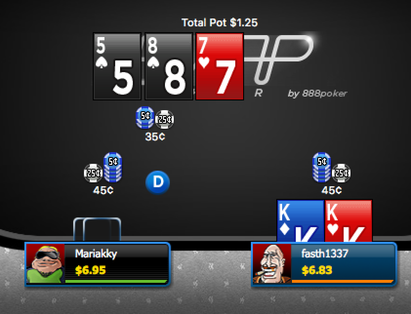 >>15524 Ну там рука-то КТ. И ставит он флоп чуть больше пол банка. Против некоторых оппов на микро будет ФЭ. Если я правильно понимаю фуллринг на нл2, у оппа будет рука карманка, которая на сет зашла.