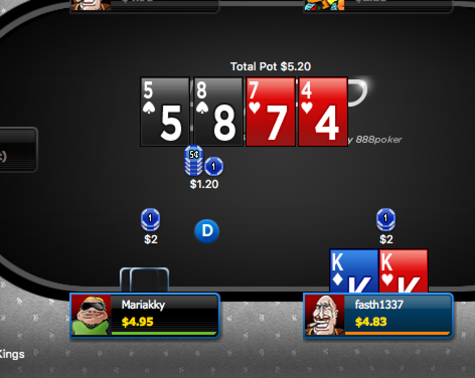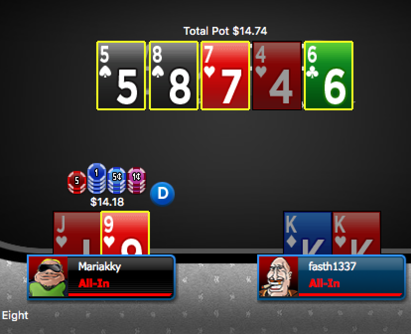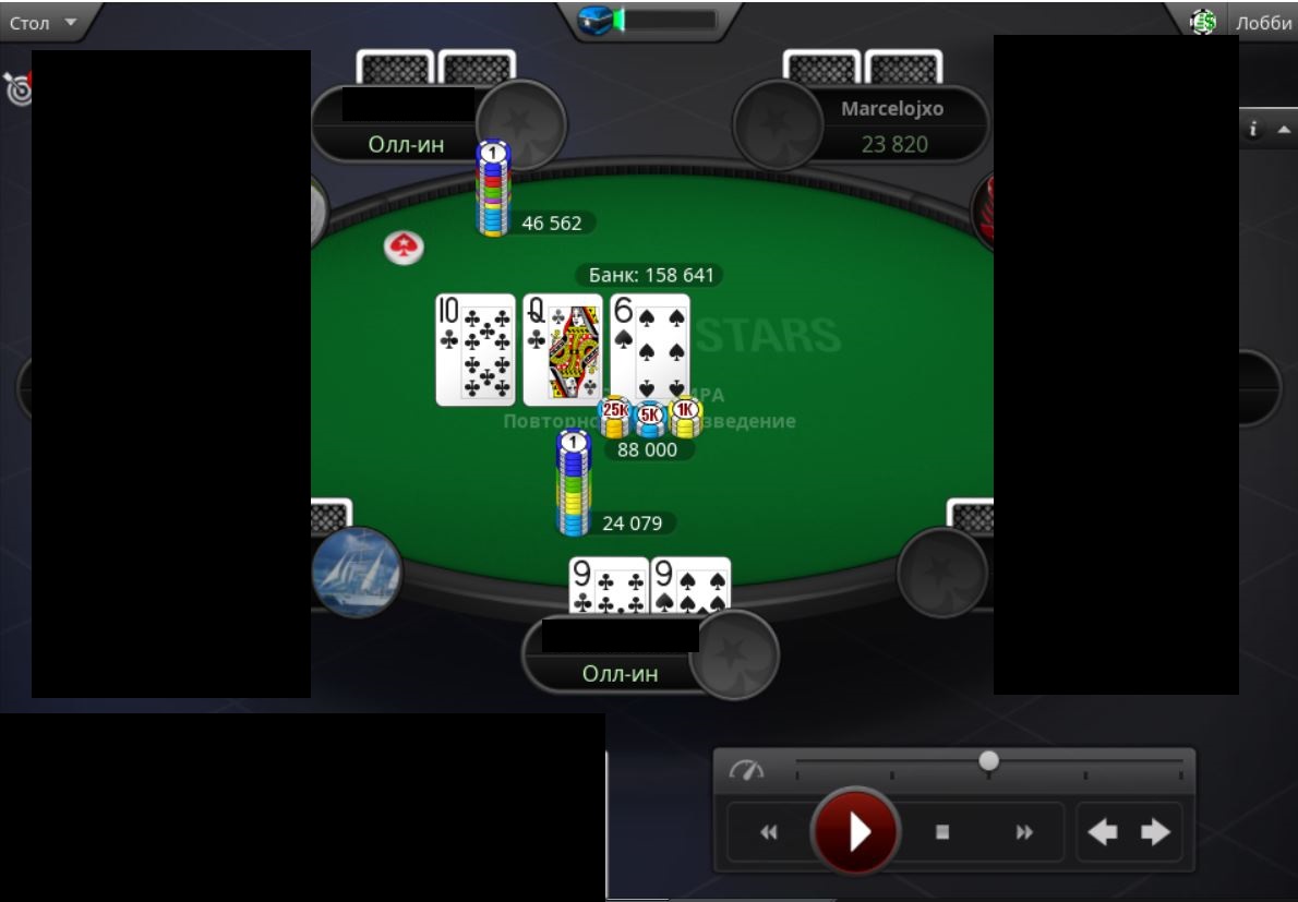 >>26408 Ну хуй знает. Слоуплей с королями не свойственен для тех лимитов, что я играю. Дальше флоп прошел без экшона. На тёрне я решил силу показать. Ну а дальше я сам ставить хотел и промахнулся. После этого подумал, что он либо с десяткой решил прихватить фишек, либо просто блефует. Королей я совсем никак не ждал.