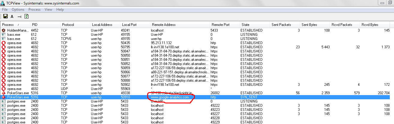 ну-ка, друзья, подскажите, шозанахуй. Интернет как-то хуево работал, решил проверить, мож там какой-нибудь левый процесс куда-нибудь чо-нибудь льет или коннектится. И увидел это. Нахуя покерстарсу коннектиться к google-analytics?