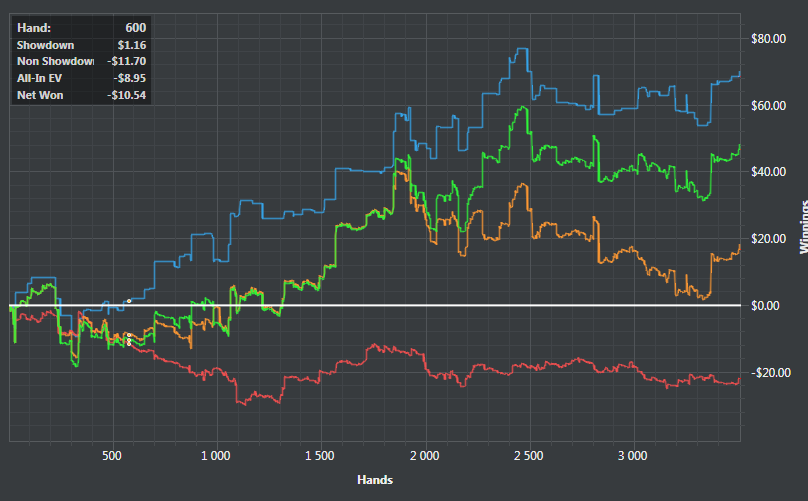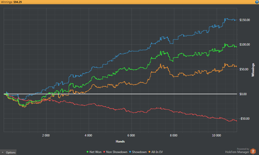 Сижу, катаю. Welcome back апстрик идет полным ходом. Передали почти в два раза. Хорошо играется на лимите, когда ты неизвестный с большим кредитом доверия. Хотя я совсем хуйню не исполняю. Это, кстати, бесит в водах, особенно стретеджи этим грешил раньше, не знаю как сейчас. Залезает жирный тренер на лимит пониже, где его в первый раз видят, и начинает исполнять блефовые 3беты/4беты налево и направо, да так, что там велью к блефам дай бог 1:6 будет, и это работает, потому что его никто не знает. От мол, учитесь как надо играть, щенки. Иди на своем рабочем лимите такое поисполняй, мудила.