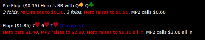 http://www.handconverter.com/hands/2996005 в аналогичной ситуации я с мидпарой на сухом борде просто вколлил ривер. Если бы опп задумался о моём рейндже чек-колла, чек-рейза на таком флопе, он бы понял, что у меня может быть только одна рука. Никто не станет чекать боттом-сет в двоих на сухом борде, а потом изолировать себя пушем. Энивей, его сет очевиден и я так и так бы пушил, так что меньше он проиграть вряд ли мог.