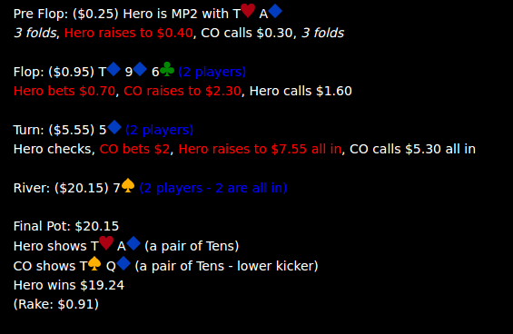 http://www.handconverter.com/hands/3001759 за столом думал о капнутости и что придётся грузить третью банку с двумя аутами. Сейчас я вижу, что ставил в мультивей и фэ на тёрне у оппа должно зашкаливать, так что сыграно нормально. С другой стороны, я открыл эту руку, потому что затосковал по фэнсиплею.