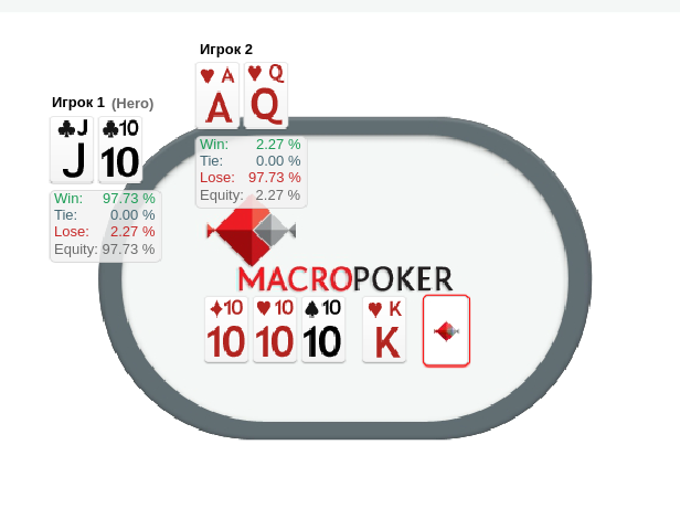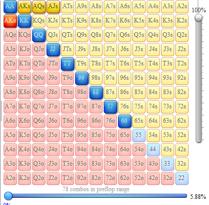 >>29801 Это я примерно сказал. На ФР нельзя с уверенностью сказать какой опен на каждой из поз ЕР и МР. У меня лично на УТГ+1 такой рейндж. Шире открываться себе дороже, да и не надо оно. Весь опен на ЕР у меня 11%. Но, во-первых, я не знаю рейндж этого оппа по вышеупомянутой причине, мож он со всех трёх поз открывает 14%, во-вторых, многие открывают в первую очередь кармашки и слабый сьютовый бродвей, отсюда и такие фолды. Всё-таки вряд ли можно найти такого отморозка, который будет выкидывать QQ на трибет. Хотя не, недавно мне пришлось 4бетить 99, потому что опп трибетил 3.5% и падал на 4бет 70%. Не представляю, что он выбрасывает, но вот такое вот интересное решение на него нашлось. Может бот какой-нибудь убогий. Алсо, я потом посмотрел, у него 4бет это QQ+, AK 90%. То бишь, ЧТО БЛЯДЬ ОН ВЫКИНУЛ, для меня остаётся загадкой. Надо бы добавить такую статку на 3бет, может какие открытия сделаю.