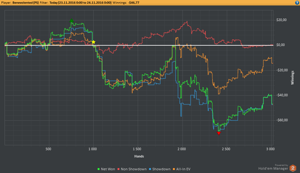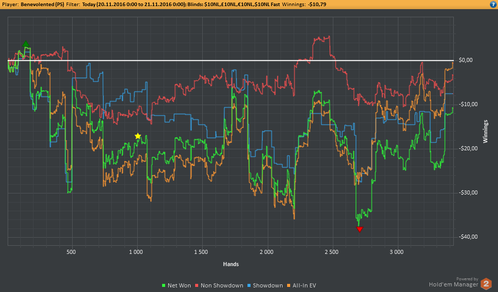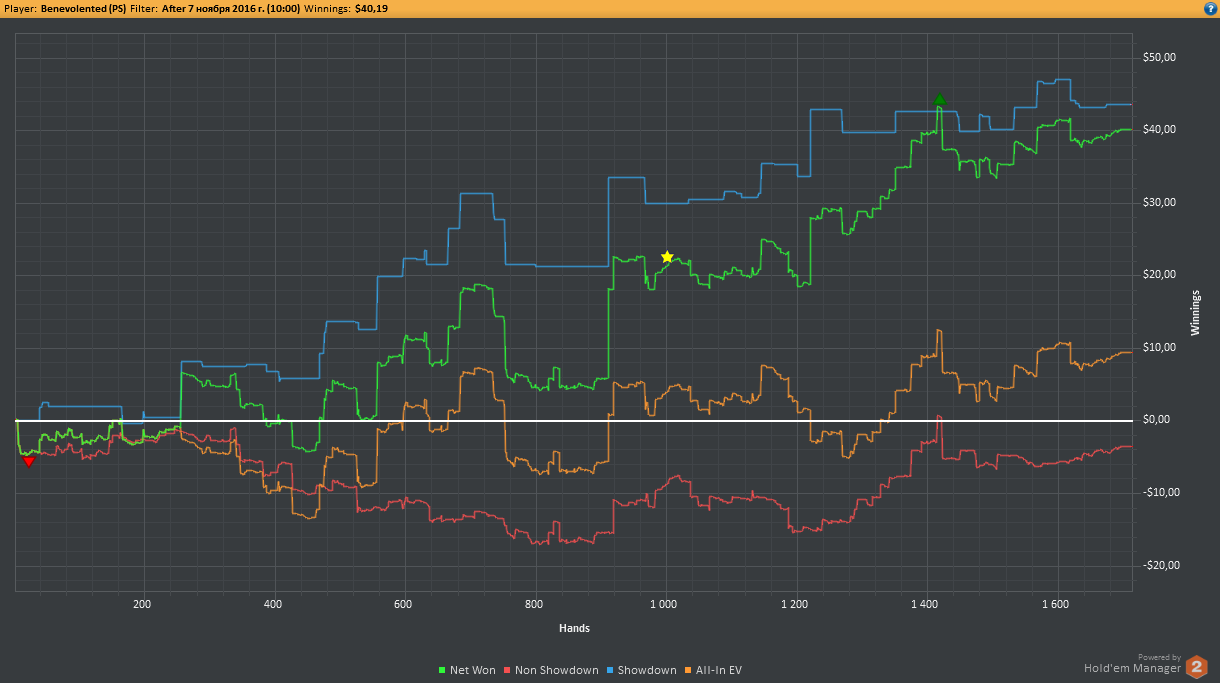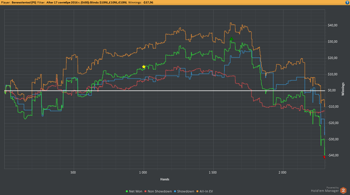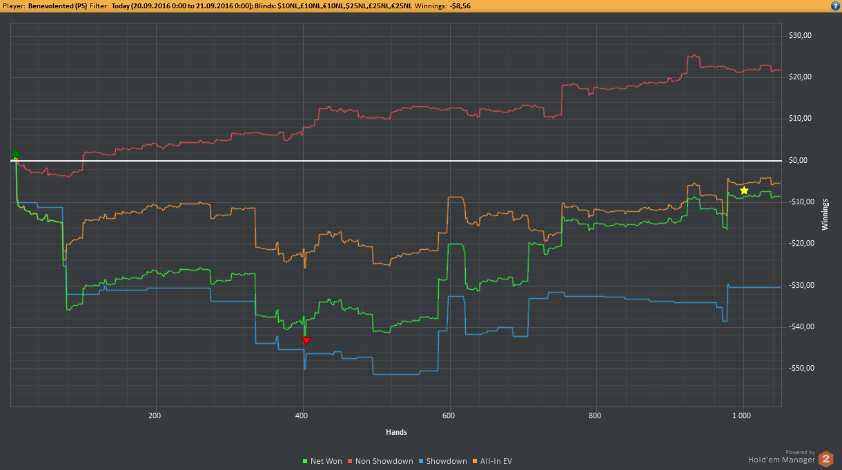 В который раз убеждаюсь, что я свой худший враг. Заливая 1 стек в тильте на 10к рук мы теряем 1бб/100 (у меня всё очень плохо с математикой если что, надеюсь, правильно посчитал). За 10к рук в тильте я заливаю пачки стеков и ничего с собой не могу поделать, но сейчас начал почитывать блог Сандрикса, где относительно этого есть интересные мысли (после того, как он за 1 сессию на нл100 залил 20БИ). Планирую по возвращению домой устроить себе терапию, скорее всего антидепрессантами, это будет интересный эксперимент, т.к. в покер я начинал и продолжаю играть в перманентном подавленном состоянии. Пора уже вылезать из депрессии, которая несомненно является фактором номер один в моей слабой игре. Я показываю А-игру около часа-полтора, при одном переезде впадаю в рейдж-мод, хотя играю я уже относительно давно и пора бы исключить тильт. Наигрыш упал в говно тоже, я любитель погриндить, но в какой-то момент я перегорел и голова отказывается больше 10-12 столов играть, максимум 20 минут выдерживаю.