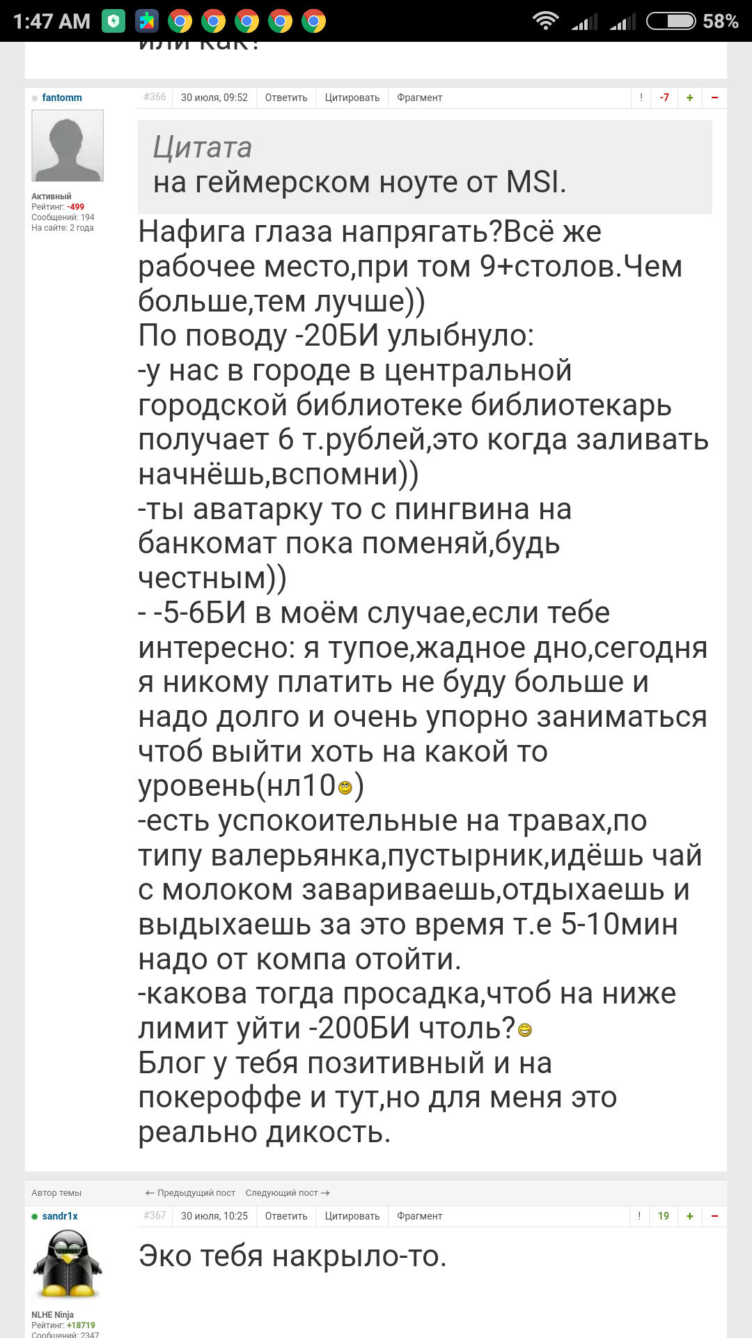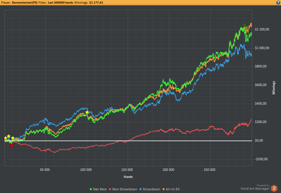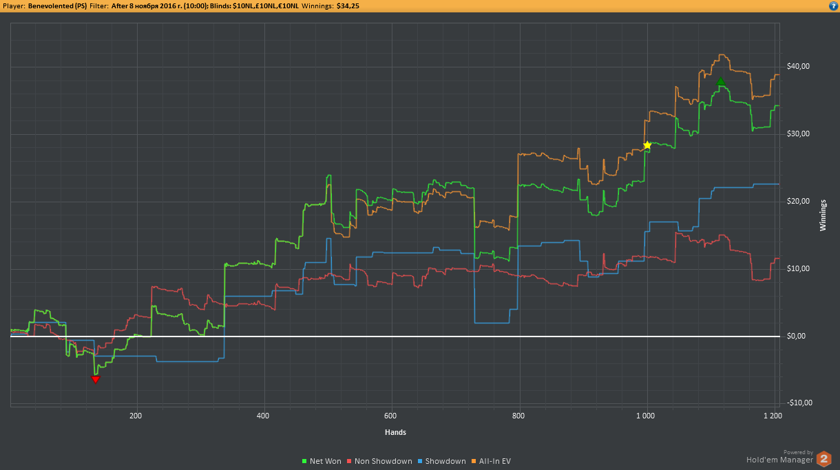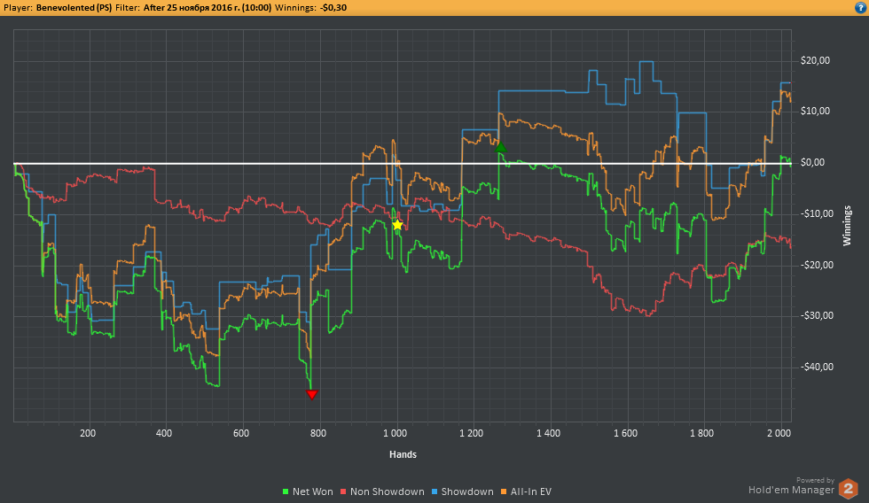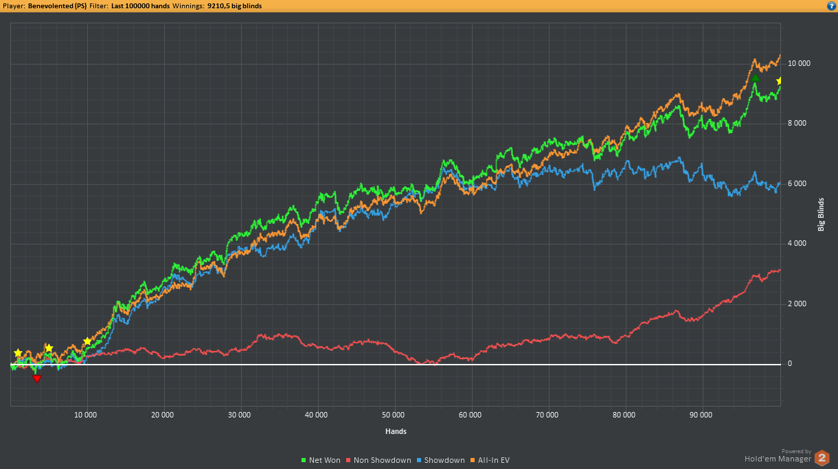 В который раз убеждаюсь, что я свой худший враг. Заливая 1 стек в тильте на 10к рук мы теряем 1бб/100 (у меня всё очень плохо с математикой если что, надеюсь, правильно посчитал). За 10к рук в тильте я заливаю пачки стеков и ничего с собой не могу поделать, но сейчас начал почитывать блог Сандрикса, где относительно этого есть интересные мысли (после того, как он за 1 сессию на нл100 залил 20БИ). Планирую по возвращению домой устроить себе терапию, скорее всего антидепрессантами, это будет интересный эксперимент, т.к. в покер я начинал и продолжаю играть в перманентном подавленном состоянии. Пора уже вылезать из депрессии, которая несомненно является фактором номер один в моей слабой игре. Я показываю А-игру около часа-полтора, при одном переезде впадаю в рейдж-мод, хотя играю я уже относительно давно и пора бы исключить тильт. Наигрыш упал в говно тоже, я любитель погриндить, но в какой-то момент я перегорел и голова отказывается больше 10-12 столов играть, максимум 20 минут выдерживаю.