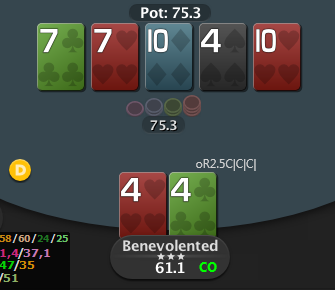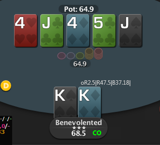 http://www.handconverter.com/hands/2996039 опп очень пассивен и даже на такой рейз лучшим решением будет фолд. Не могу заставить себя очевидные доборы сбрасывать из-за шансов банка.