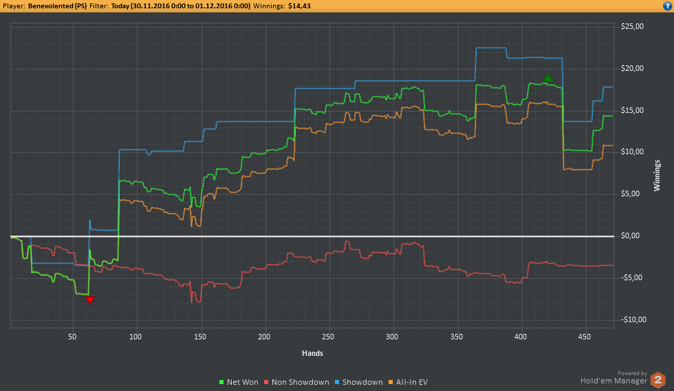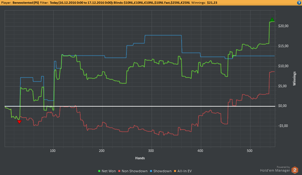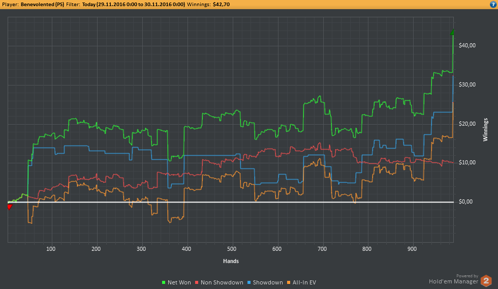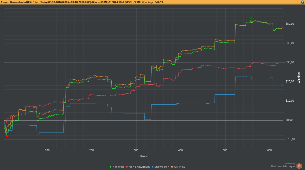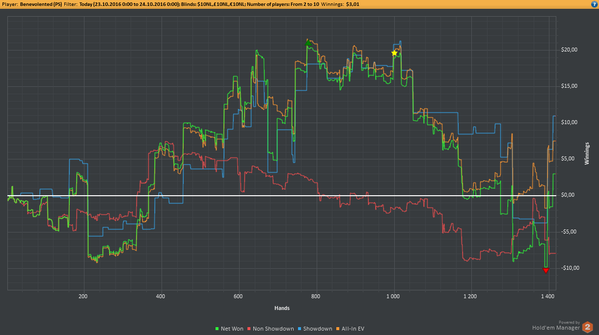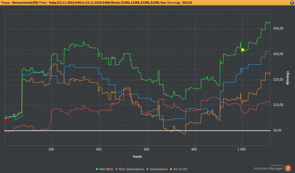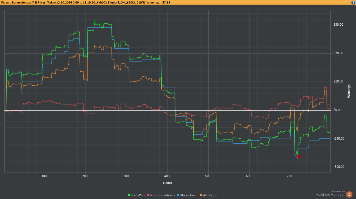 Сегодня играл хуже чем обычно. Переехал АА в тильте, лол. Две приятные вещи: додумался разобрать аллиас регов на ФРовских позах, узнал много нового про опены в ранних позициях как же ужасно реги играют эти позы, а я и того хуже + пока что на нл25 иду около нуля, что не может не радовать. Конечно, у оппов на меня ещё нет статистики, но и я боюсь в полную силу играть, применяя какие-то мувы и экплоитя дорогие дыры оппов. Так что на дистанции я должен бить этот лимит без особых проблем. А пока что я и нл10 и нл25 стал играть в ноль из-за проблем с самоконтролем. Уже на этих выходных я либо поебусь, либо заполучу в свои лапы огромный дисплей, на котором смогу гонять оппов в тысячу столов. Оба варианта должны сильно усилить меня.
