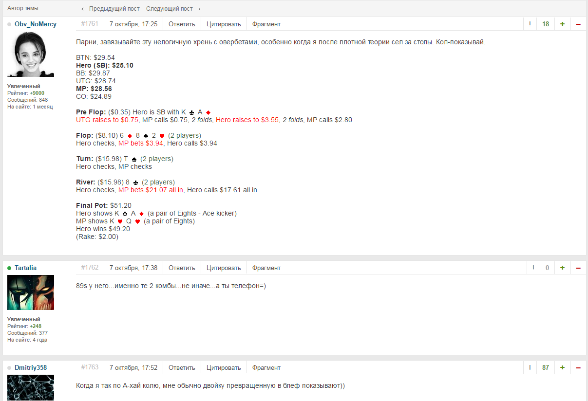 Ну вы тут говно развели. В раздаче с ATo опп классический агроморрон, который рейзит каждую вторую руку. По ранауту отличному от бубны я бы падал. Прикинул, что против такого оппа у меня всегда будет минимум около 30% с ТПТК и натсовым фд, я запушил в его недостек. Кукарекеры-семёны про майнинг, программы-подсказки и прочие Святые Граали невероятно смешны. Я играю с ХМом и могу оценить свои шансы, а вы походу вообще без стат гоняете, если делаете вывод по раздаче в АБСОЛЮТНОМ, блядь, вакууме. Смотрите в свои карты и на борд. Ох, пиздец, нас рейзят на таком опасном борде! Фолд! В общем, идите нахуй из моего блога, с вами конструктива никакого не буду вести, кучка дебилов залётных. S&G.