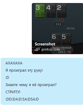 http://www.handconverter.com/hands/2984540 Опп вроде адекватный, но я не понял, нахуя он так ебенит, при том, что я на флопе чек-коллил буквально пару тузов с бдфд. В общем, не поверил я ему почти. Даже хз, чё делал бы на любом бланке или червовом борде. За эту раздачу мне в аду уже забронировано лучшее место вечных куллеров.