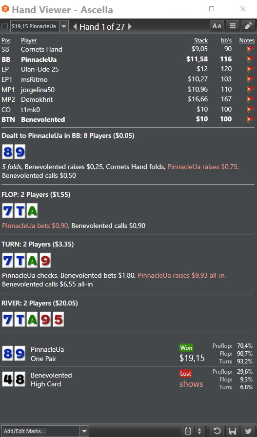 >>29777 >Стразы, конечно, умеют сдавать грязь, но отскочить хотя бы от рега можно было, хоть и узко, хоть и по шансам уже. Блядство, если бы я понял, что по риверу закрылся стрит, то точно бы отскочил. Рука меня очаровала :(