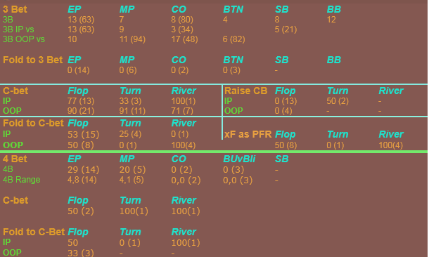 Теперь он выглядит так - пик 1. Ещё немного попилил поп-ап 3-4бетов, решив замёрджить их обратно в один, как и делал изначально. Добавил рейзы кбетов, чек-фолды в 3бет-потах. В мэин поп-апе добавил стату 3бета по флопу, тёрну и риверу. Если есть стата ответного фолда-колла ререйза, то буду благодарен за инфу.
