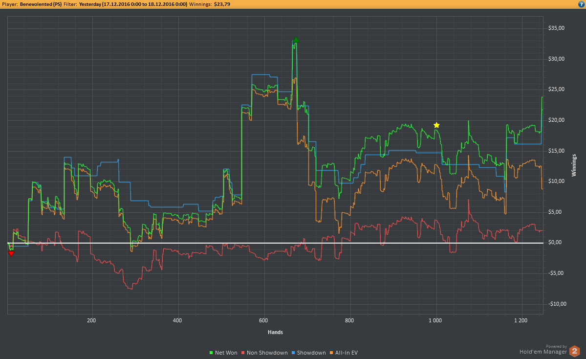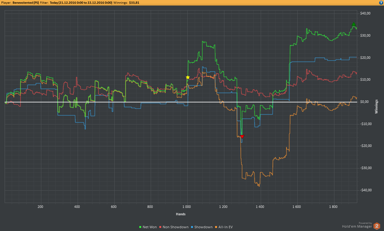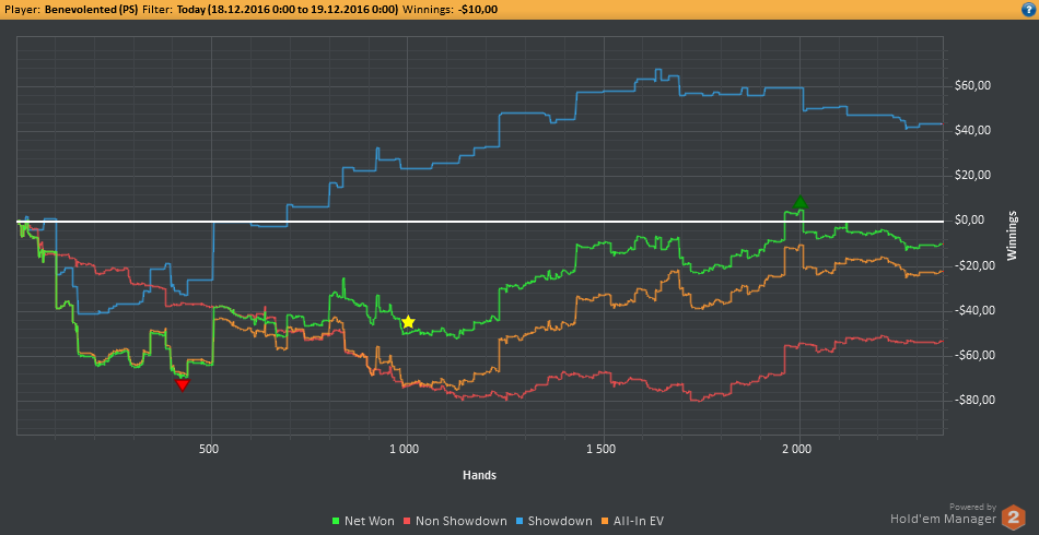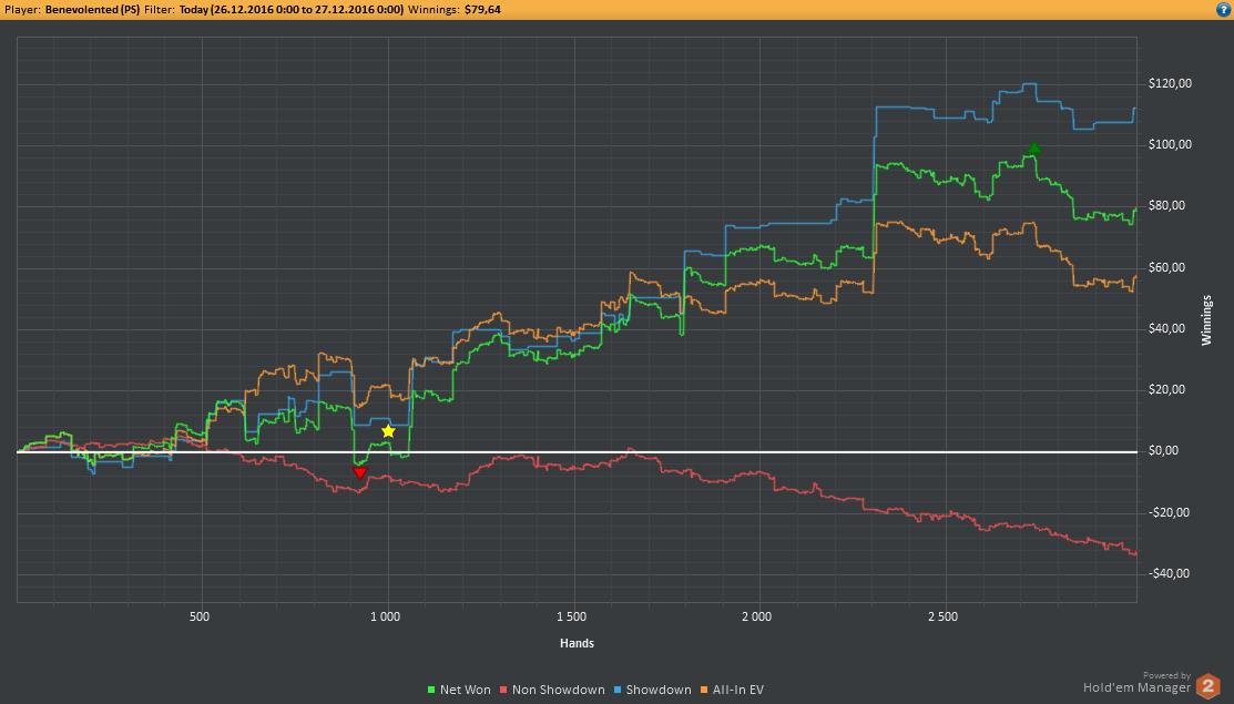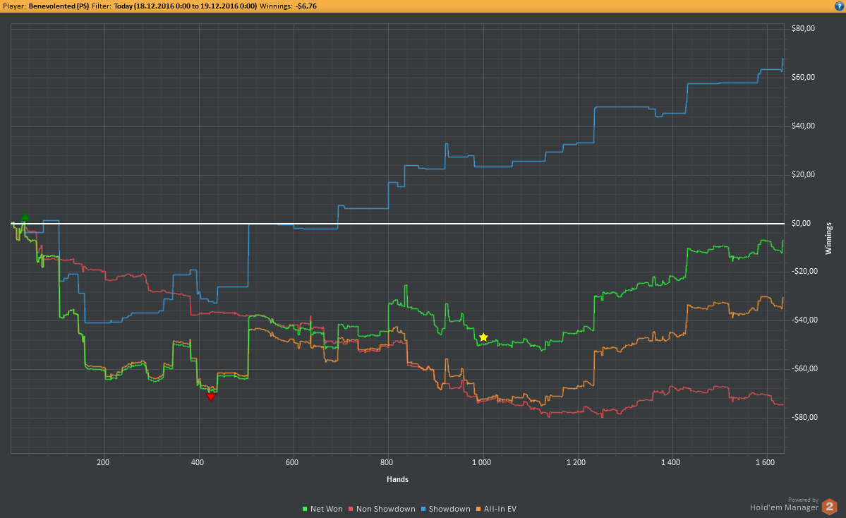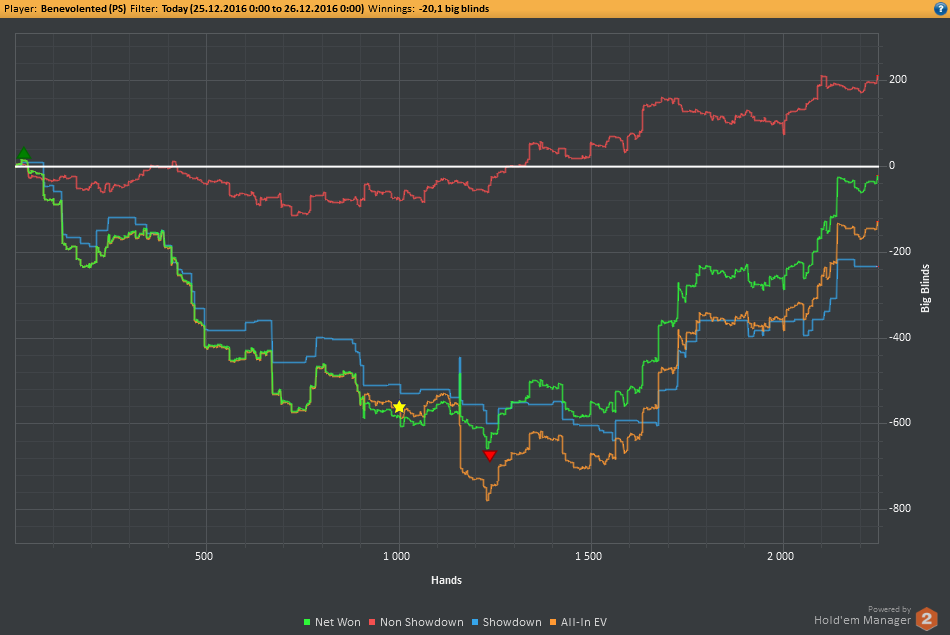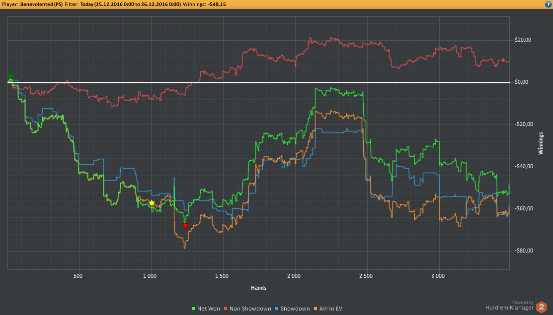 На новый год не придётся тратиться, потому что у меня уже есть ОХУЕВШАЯ ЁЛКА. Меня ебут. Меня выбивают там, где не должны, и вэльюбетят там, где я не жду этого. Плюс я боюсь делать дорогие блефы (дорогие, а не тупые на стек, их я сегодня сделал овердохуя). Я вообще не ставлю там, где раньше всегда бы поставил. И на меня не давят деньги, я просто задаю оппонентам очень высокую планку. Мол, раз пацан поднялся выше меня, то он точно не сбросит 3-ю пару здесь на мой блеф. Я не делал ещё ни одного овербета.