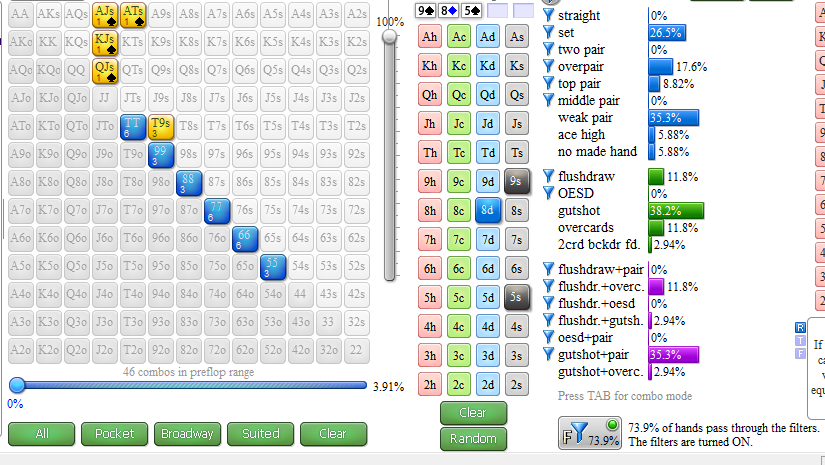 >>30021 Самый низ из своего диапазона (третие пары, гатшоты, бекдоры) лучше всего превращать в блеф. Я бы как минимум 30% всех 77 рейзил бы на флопе. Хотя тут от ситуации зависит, от позиции, и т.д. Зачастую на таком флопе у нас почти всегда есть блефкетчеры получше.