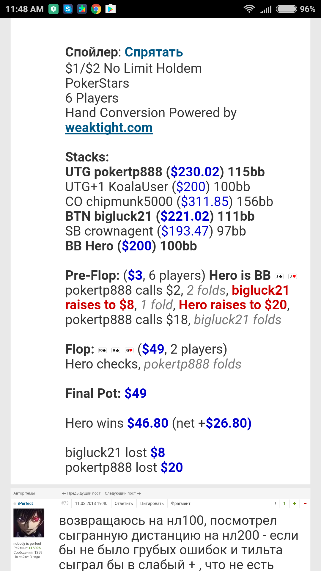 >Вообще он годные вещи пишет и единственное, что мне не понравилось это параша, которую он прогнал с открытием 2.5бб с утюга и что типа 3бб нас на дистанции сожрут. Зря смеёшься, можешь сам посмотреть в ХМе средний банк в бб и средний рейк. Мы же играем по сути только, чтобы украсть блайны. Если бы нам отдавали блины без боя, мы бы играли с каждой позы 150бб/100, а на блинах в ноль. Советую посмотреть на лимиты повыше, там открытие в 3бб уже не такое частое явление.