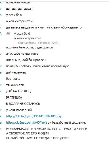 В клубе 95 человек, однако, здравствуйте. Все действо по прежнему происходит в конфе, взамен слабых, ушедшихопущенокэмо потихоньку подтягиваются люди, и пережившая недавно спад активности священная конфа опять оживает. Недавно один анон предложил интересную идею, поскольку у многих на счетах копейки или вообще 0, мы решили докинуть деньжат и устроить сентябрьский микролимитный марафон. Суть проста - участники играют в течении месяца, в конце определяется победитель и все проигравшие выплачивают ему часть того, что наиграли сами. Если быть точным, то правила таковы: - 1)НЛ2-НЛ5 (ЛЮБЫЕ СТОЛЫ) - 2)ПОБЕДИТЕЛЬ ПОЛУЧАЕТ 20% ОТ НАИГРАННОГО С КАЖДОГО ПРОИГРАВШЕГО - 3)СТАРТ В 00:00 01.09.13 - ОКОНЧАНИЕ 00:00 01.10.13 - 4)Обладатели минусового графика по окончании не платят взнос - 5)Отчетность с помощью графиков за указанный период по двум лимитам На данный момент участвовать согласилось 3,5 анона, у вас есть еще время добавится в конфу и записаться. И еще, на счет кидалова. Все конечно понимают что это возможно, особенно со стороны ньюфагов клуба. И не смотря на то что меня уже кидали на 10$лол, думаю все же у людей хватит мозгов понять насколько это невыгодное предприятие, т.к. ник и все известные данные этого покериста естественно будут засвечены (и обсосанны) не только тут, но и на всех известных покерных ресурсах всей нашей уютной конфой.